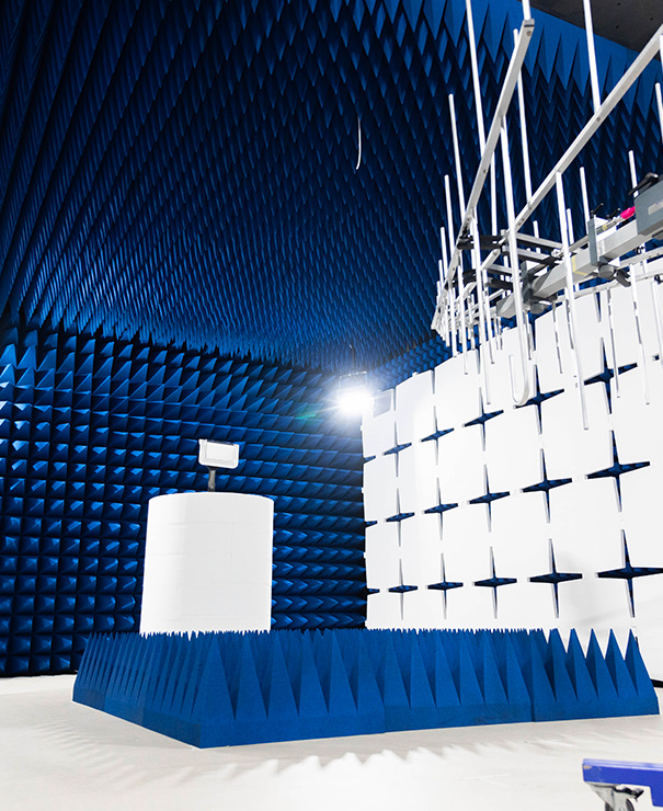 La chambre anéchoïque permet d’effectuer des campagnes de mesures afin de s’assurer de la conformité du produit aux normes en vigueur, aussi bien en émissivité qu’en immunité (interaction du produit dans son environnement).